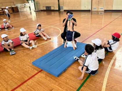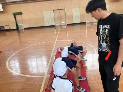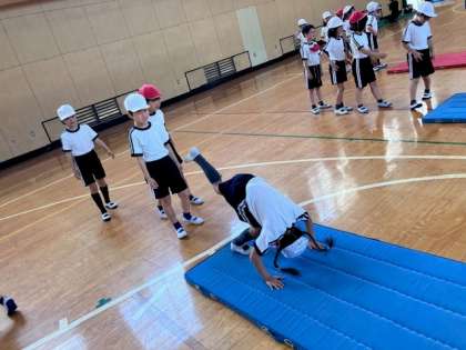 背支持倒立やブリッジ、前回りや後ろ回りを取り組みました。