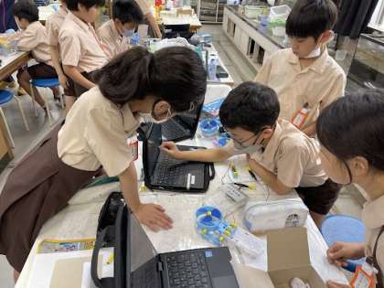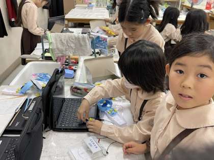 4年生の理科では、「電池をつなぐ向きを変えると、モーターの回る向きが変わるのはなぜか」について、簡易検流計を用いて調べました。班で教え合いながら、実験をしました!