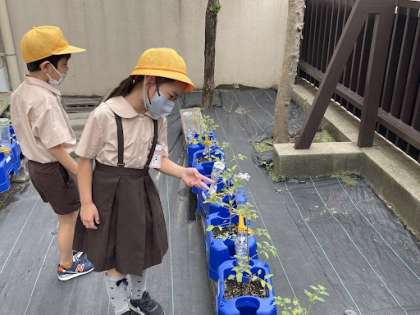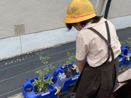 2年生がミニトマトに水やりをしていました!!暑くなってきているので、きっちりと水やりをしています!!