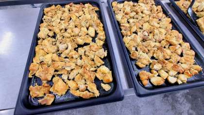 白ワイン、塩、粗挽きこしょう、ガーリック、カレー粉、綿実油で下味をつけた鶏肉を、焼き物機で15分間蒸し焼きにします。