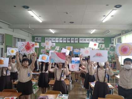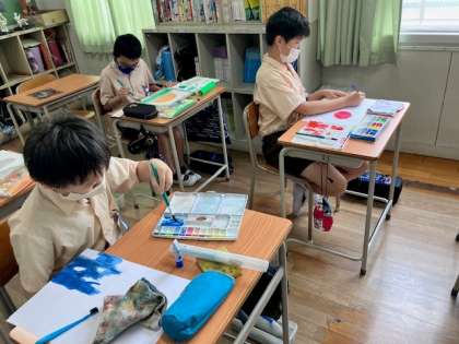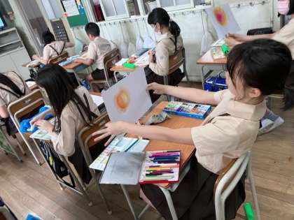 美術では、太陽の絵を描きました。近くで見ながら描いたり、絵を俯瞰しながら次にどう表現するか考えたりしながら思い思いの絵を描くことができました。