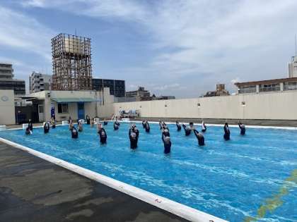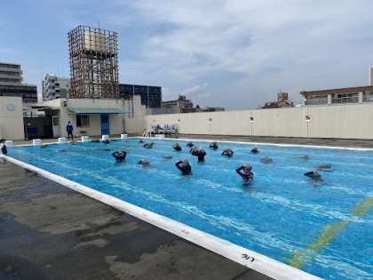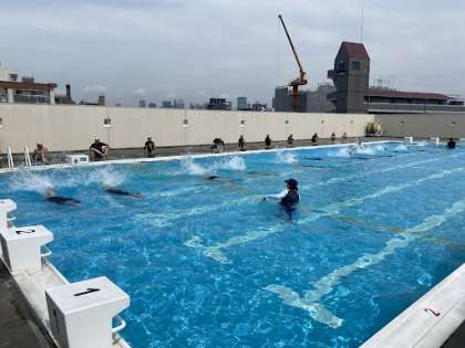 午前中は曇り空で少し寒そうでしたが、午後になって晴れてきました!25メートルを泳ぐ前にしっかりと準備をしているところです。