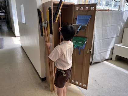 栽培美化委員会の児童が掃除用具のチェックをしてくれています。