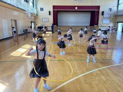 1年生が講堂で遊んでいました!! フラフープやボール運動をして元気いっぱいです!!