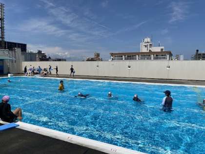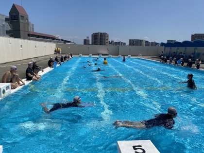 平泳ぎを練習中の人は、ビート板を使って足の練習に取り組んでいます。40分授業でもたくさん泳いでしっかりと練習を重ねています。