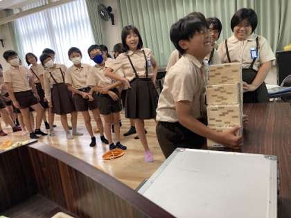 レプリカの1億円を見せてもらい大歓声が!!実際に持ち重みを感じていました。