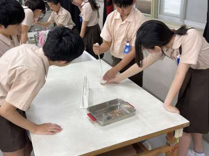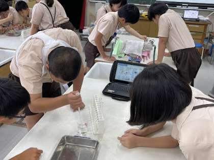 理科の時間、6年生はピペットの使い方の練習をしました。水の量の調整に苦労しているようでした!