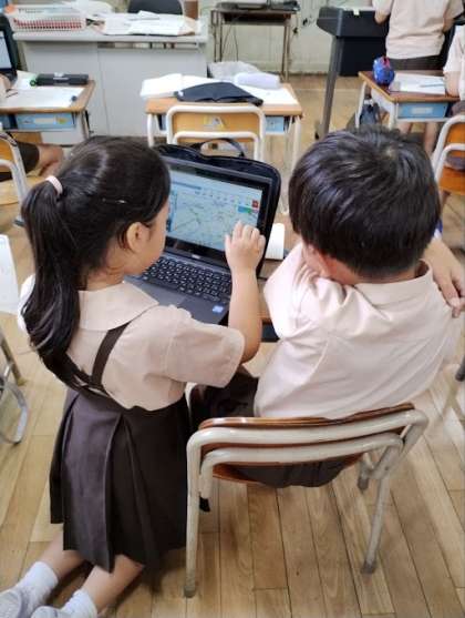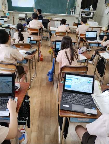 タブレットの地図を使って、野里小学校からUSJまでの距離を測ったり、100キロメートル離れた所はどこかを調べたりしました。