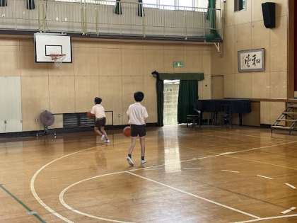 休み時間、講堂では6年生がボール遊びをしていました!最近話題のおかげか、バスケットボールをしていました!