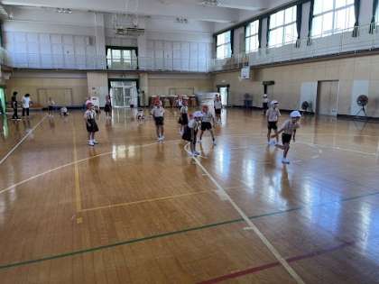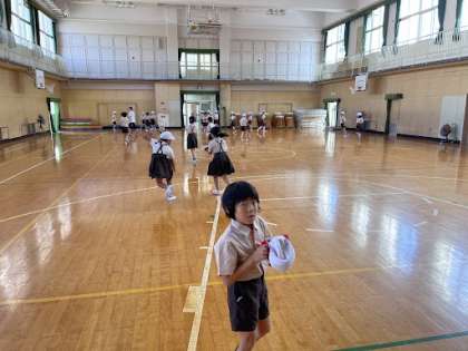 休み時間2年生が講堂で、鬼ごっこやだるまさんがころんだ、をして遊んでいました!外はかなり暑さが厳しいですが、講堂は少しマシでした。。。