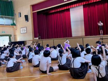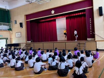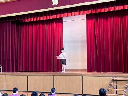 今日は児童朝会で「何が通ったでしょう」をしました。
