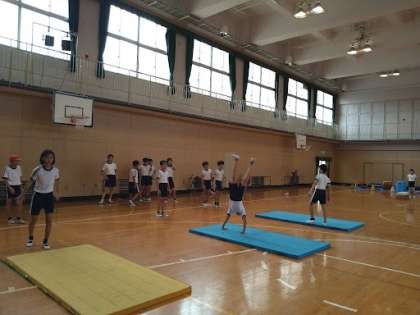 6年生は、体育科でマット運動に取り組んでいます。 手のつき方や体の回転を確認しながら、側転の練習をしています。難しい技、ロンダードにチャレンジする児童もいます。 準備や後片づけもみんなで協力して行うと速いです。