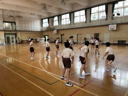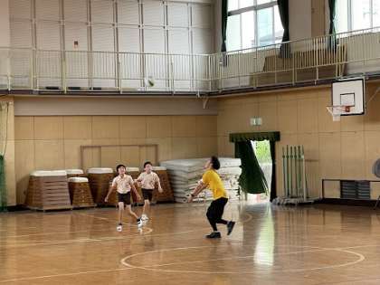 15分休み、6年生が講堂でいつも通りバスケットボールやバレーボールををしていました!!