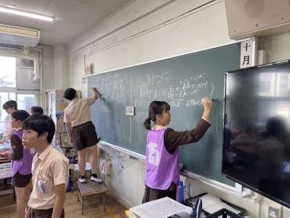 今日は朝の集会の時間に、各たてわり班に分かれて、来週の「全校オリエンテーリング」の「めあて」を決める話し合いを行いました!