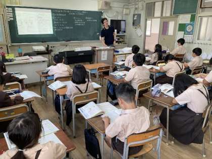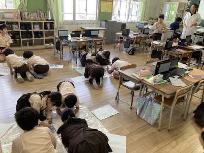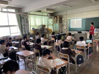 4年生の外国語活動は映像から日本と各国には時間差がある事に気付き、何をしているか聞き取りました。