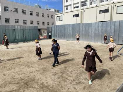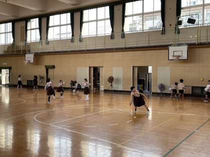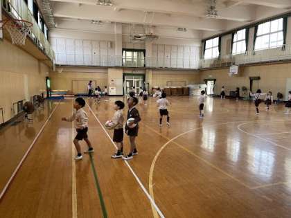 1年生が、今度は講堂で遊んでいます!フープやボール遊びなど、笑顔があふれていますね!