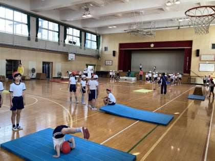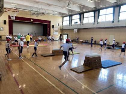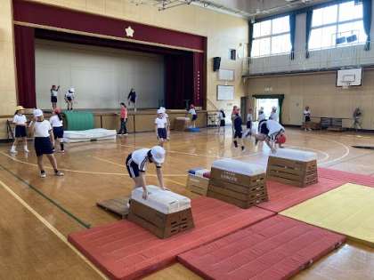 4年生の体育は学年でマット・跳び箱運動をしています。安全に気をつけながら場の工夫を行い、各自がめあてをしっかり持って運動に取り組んでいます。