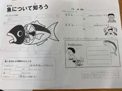 魚に含まれる栄養素やその働きについて学びました。体にとって必要な栄養が魚からたくさんとれることがわかりましたね。苦手な人も頑張って食べてみましょう!