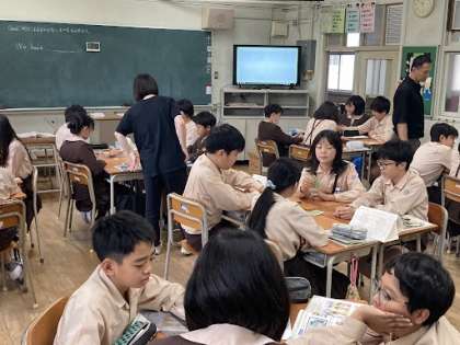 6年の英語「町にあるものとないものを伝え合おう」ではカードを使ってゲーム形式で会話を楽しみました。