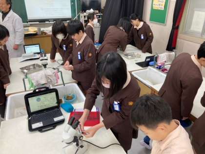 理科は火山灰の粒の様子を顕微鏡で観察して特徴を捉えています。
