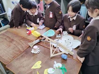 国語の時間に、作り方や遊び方の説明文を書き、生活科の時間に的あて・糸電話・けん玉・竹トンボ等、1年生に喜んでもらうためにいろいろ考えておもちゃを作りました。