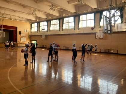 体育「バスケットボール」はチームごとにシュートの練習をしています。チームワークが高まるような友だちの声かけを増やしていきたいです。