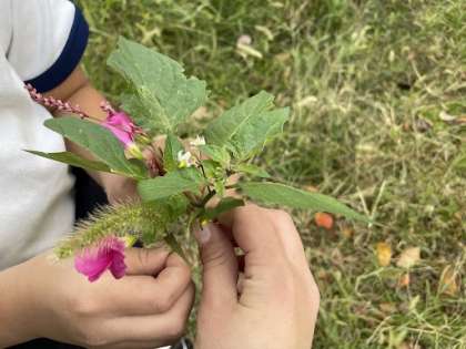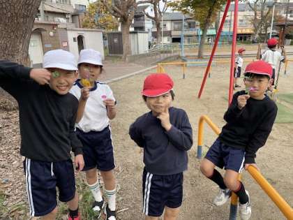 グループに分かれて花や葉っぱを見つけました。「こんな綺麗なのがあった!」「葉っぱのベッドつくれるやん!」などと色々なアイデアが出て、花束を作ったり、葉っぱのシャワーをしたりして、秋の自然を感じました。