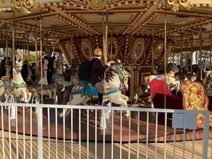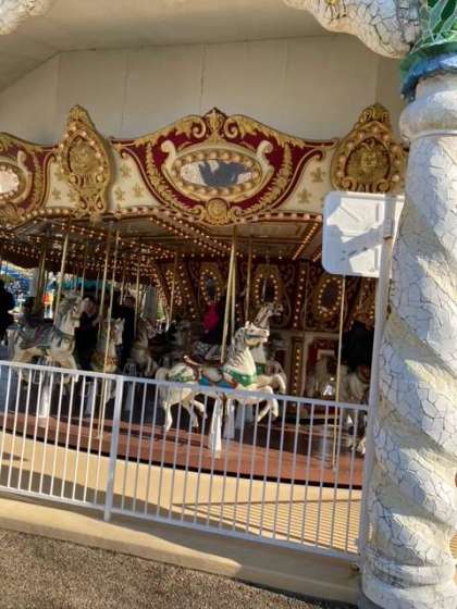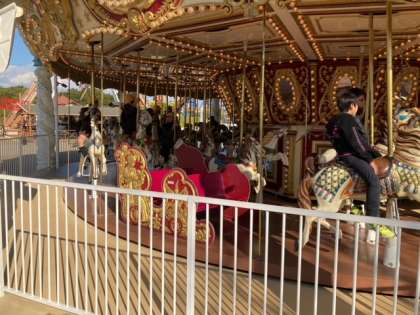 スリルのある乗り物の前にメリーゴーランドでまったりとした時間を楽しんでいます。