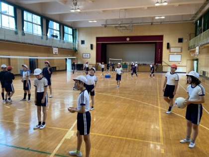 体育はバレーボールをしました。ラリーが続くようにレシーブの練習をしています。