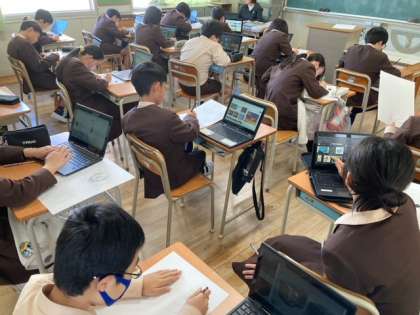 図工でタブレットを参考にしながら3Dアートに取り組んでいます。