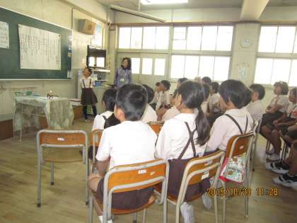 西淀川図書館のおはなしボランティアグループ「パタポン」の方が来てくださり、各学年に応じたお話や手遊びを教えてくださいました。