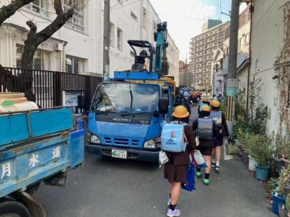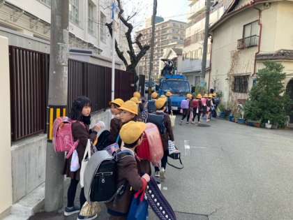 北門からの下校です。安全を最優先にして一列で歩いて帰ります。
