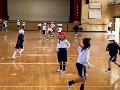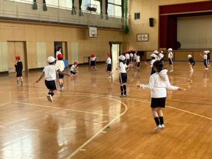 体育館で縄跳び・しっぽとりをしました。縄跳びは場所を取らす運動量が多いので体力づくりにピッタリです。寒さに負けない体力をつけてほしいです。