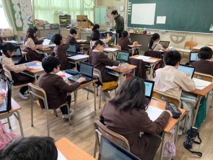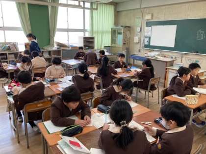 国語で百人一首を学習しています。お気に入りのものや調べたいものを決めて、タブレットで一人一人で調べたりグループで話合ったりしています。