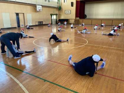 体育は準備運動でストレッチをしますが運動不足で体の硬い児童もいるので怪我をしないように体をほぐしています。