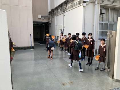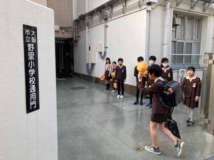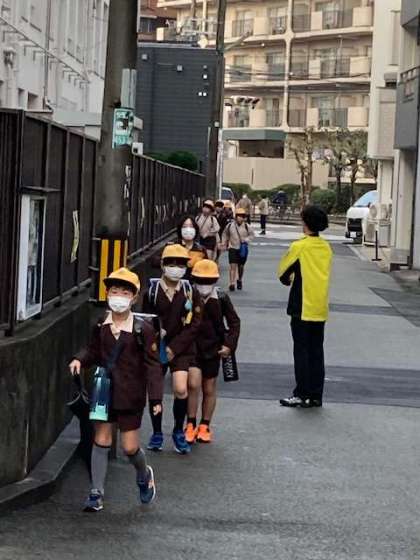 登校の様子です。安全に気を付けて一列に並んで歩いて登校しています。保護者・地域の方には本当にお世話になり感謝しています。子ども達は帽子を脱いで気持ちの良い挨拶ができています。