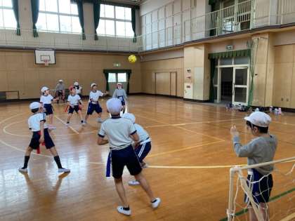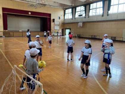体育はハンドボールをしました。パスを繋いだり走ったりして作戦を工夫しています。