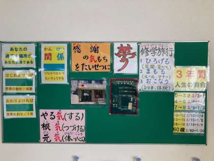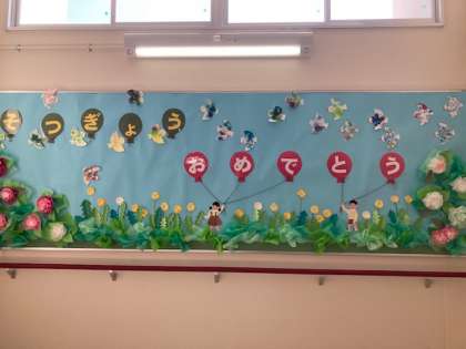 卒業に向けて掲示板を準備しています。もうすぐ6年生は最後の給食をとります。卒業生のために準備を手伝う5年生以外は13:30に下校です。