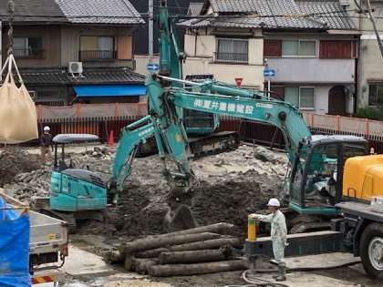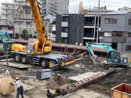 西校舎の基礎杭を順に抜き取っています。大規模な作業です。