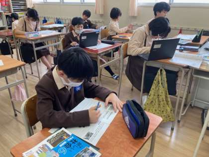図書館で本を借りた後はタブレットを活用しながら社会の学習に取り組んでいます。