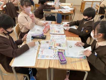 社会「国の政治のしくみと選挙」では班で選挙について調べたい事を話し合って課題を相談しています。また、学習した内容を新聞にまとめていきます。