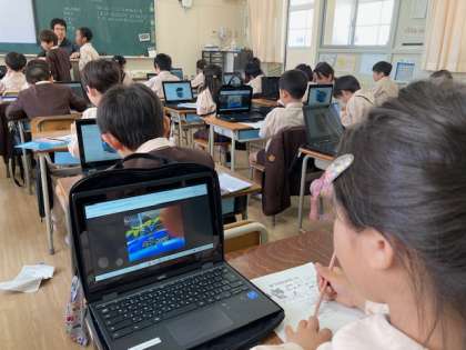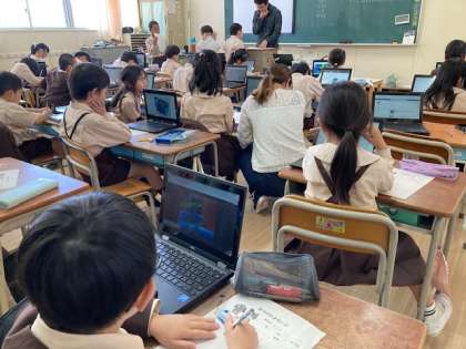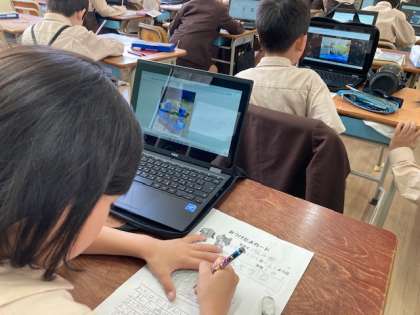 生活科「ミニトマトのかんさつ」ではタブレットを活用してまとめています。