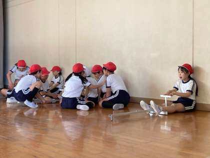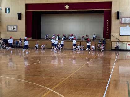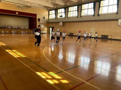 スポーツテストのシャトルランをしています。リズムに合わせて、20mの距離をできる限りたくさん走るように頑張ります。持久力をはかるテストです。