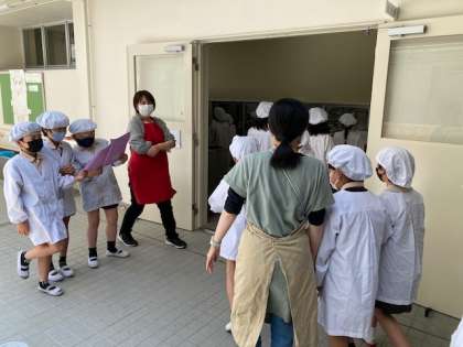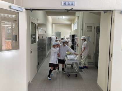 給食の時間には、放送委員がお昼の放送を流したり、給食委員が配缶のお手伝いをしたりして準備がスムーズに進むよう役割を果たしています。