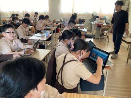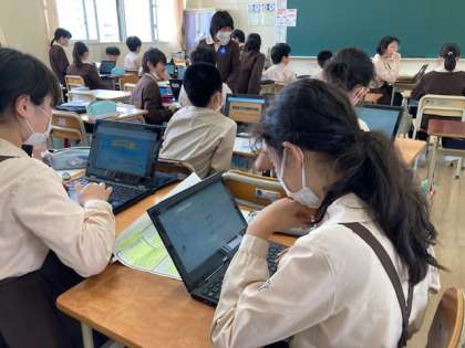 タブレットを使って平和について調べたり英語に取り組んだりしています。