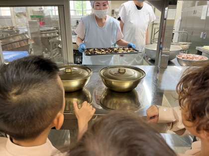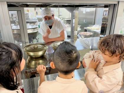 調理員さんとお話をし、給食室の「ひみつ」を教えてもらいました。