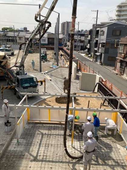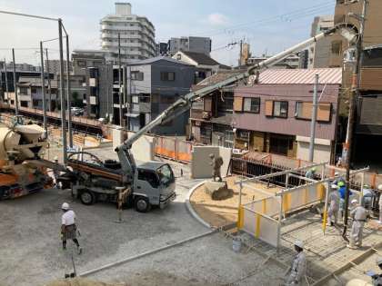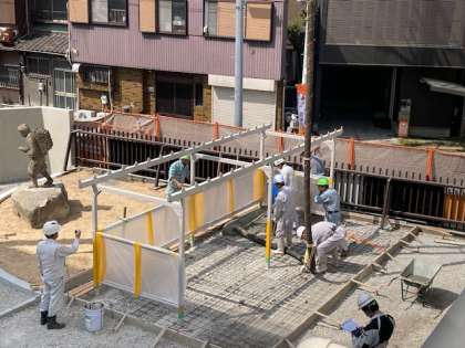 駐輪場付近にコンクリートを流し込む作業をしています。まさに「基礎固め」なので、慎重に作業を進めています。