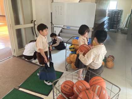 給食への関心を高めるために給食委員会ではポスターやクイズを作っています。運動委員会は運動用具の整備をしたり体力を高める運動を考えたりしています。