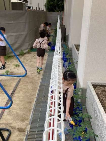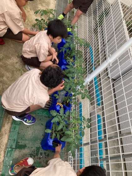 夏を思わせる日差しです。2年生が育てているミニトマトに花が咲きました。実ができるのが楽しみです。