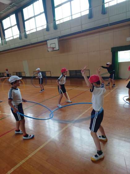 あいにくの雨でしたが、講堂で元気に体育をしていました。